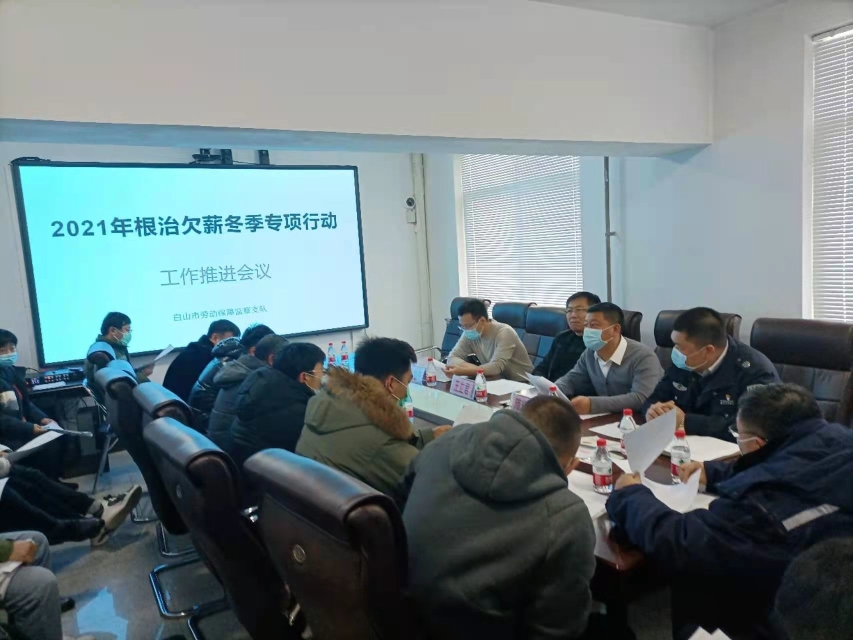 为深入开展2021年度根治欠薪冬季专项行动,确保行动取得实效,切实维护农民工依法获得劳动报酬权益。2021年12月1日,白山市根治拖欠农民工工资工作领导小组办公室在市劳动保障监察支队四楼会议室组织召开了根治欠薪冬季专项行动工作推进会议,参加会议的有市领导小组办公室主任王立君,市直19个在建工程项目经理、劳资专管员及市劳动保障监察机构全体工作人员。